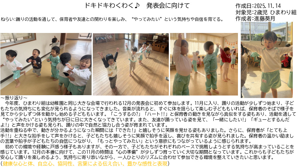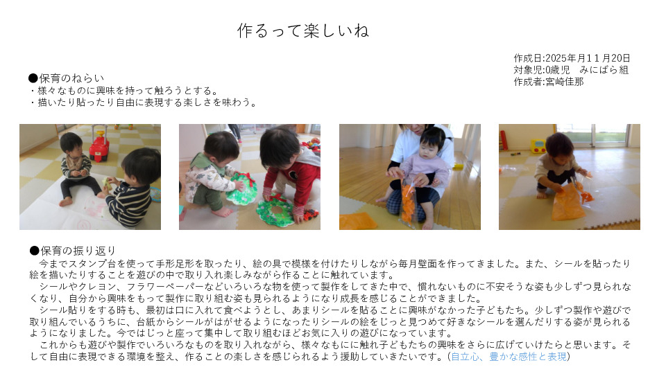 この記録から、子どもの興味や関心、発達や成長を見極め、その子に適した保育を考えて行います。